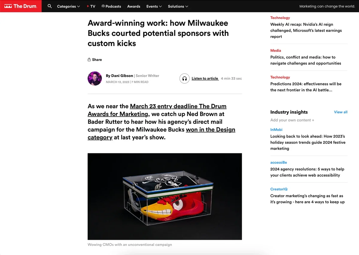 In 2021 the Milwaukee Bucks needed a new patch sponsor for their jerseys. In order to find the right sponsor we designed 20 custom Giannis Antetokounmpo’s size 16 Nike Freak1 shoes with sneaker artist None Above. Each pair was delivered to a global brand’s CMO in a custom box, with a video display sharing our story. In the end a sponsor signed a multi-year deal.